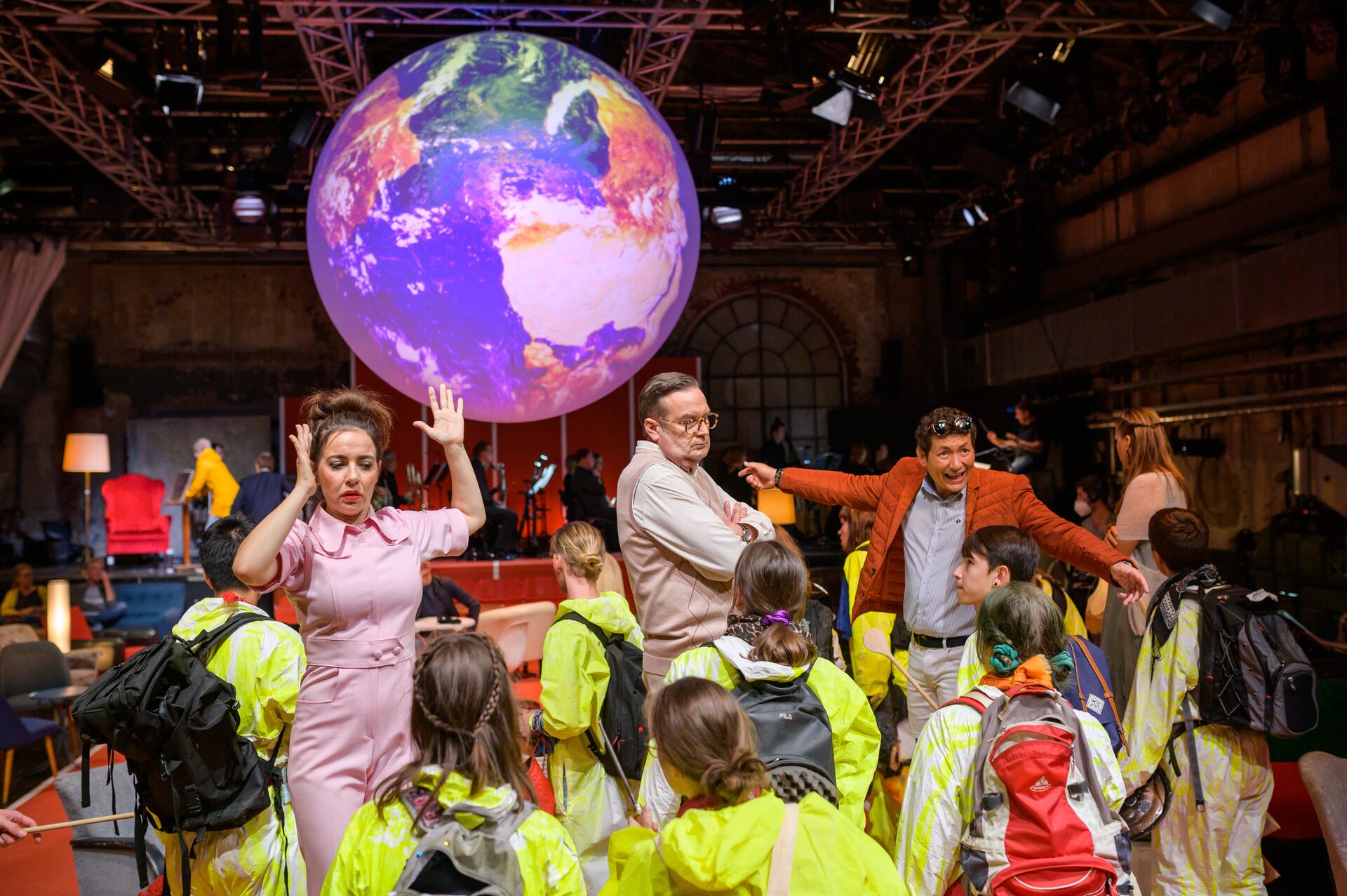 Szenenfoto aus der Inszenierung „Welcome to Paradise Lost“, Musiktheater von Jörn Arnecke und Falk Richter (Regie: Andrea Moses, Bühne und Kostüme: Christian Wiehle, Video: Sarah Derendinger, Koproduktion von Kunstfest Weimar und Deutschem Nationaltheater Weimar, Premiere: 3.9.2022 im e-werk weimar) Foto: Candy Welz